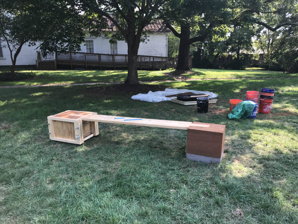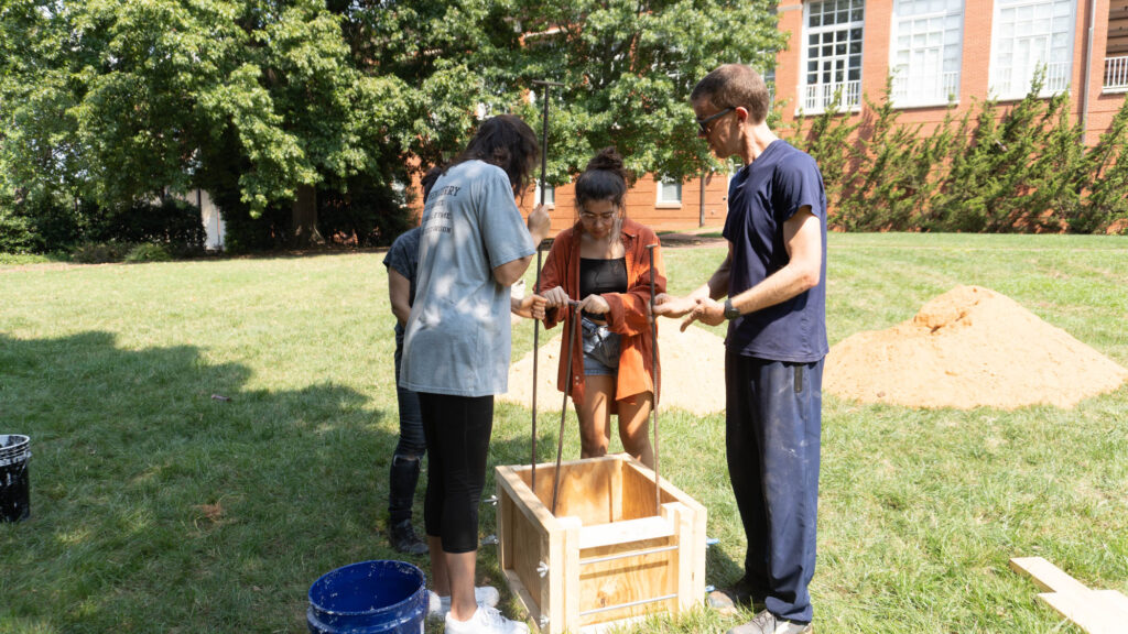 ‘Taller de tierra’  actividad realizada en Carolina del Norte, dirigida por Karen Poulain y coordinada por Lia Newman. Durante el taller se dio forma al diseño y construcción de una banca para el campus Davidson College. Construida mediante un proceso de tapia pisada con tierra de la zona y madera, la pieza explora el diálogo con el entorno.